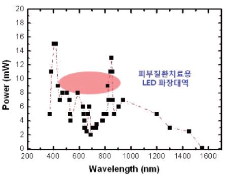상처 치유 및 통증 완화에 효과가 있는 것으로 알려진 600∼700 nm 대역의 LED 광 출력은 평균적으로 10 mW/chip 이하를 나타내고 있으며, 특히 치료효과가 높은 650∼680 nm 대역의 LED 광 출력은 5 mW/chip 이하 수준입니다.